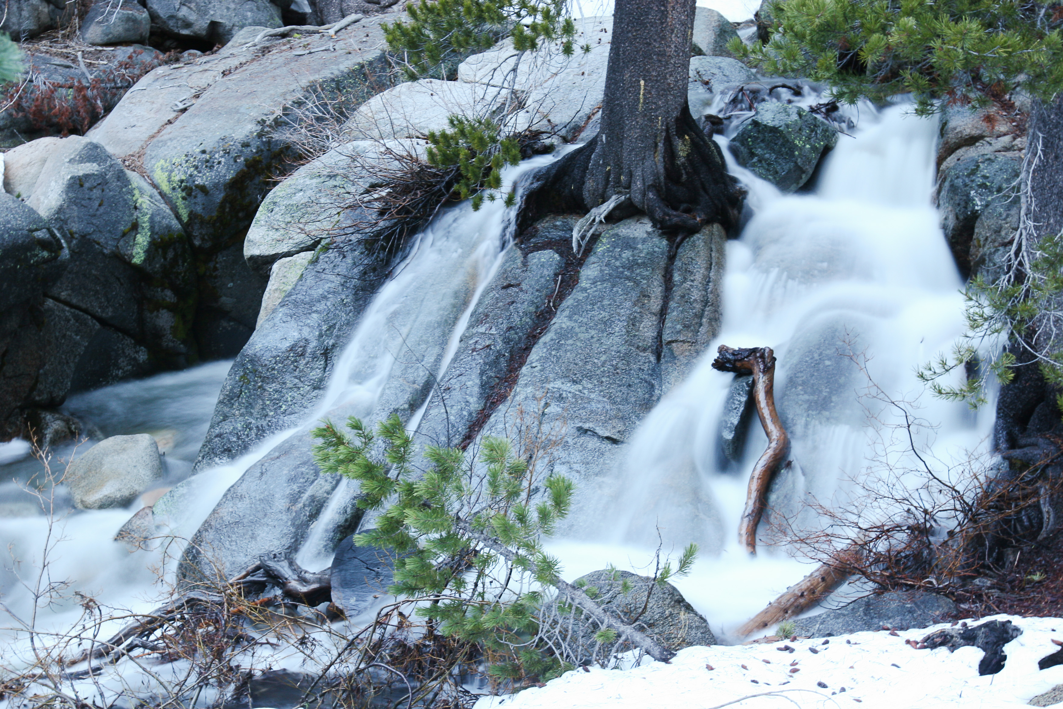 The road to Ebbetts Pass had opened up and I decided to get up early and drive up to Alpine Lake to catch the sun rise. It was cloudy and overcast. I wasn’t able to get the sun rise. But, I could hear water flowing fast and there was this waterfall near the cabins at Alpine Lake.