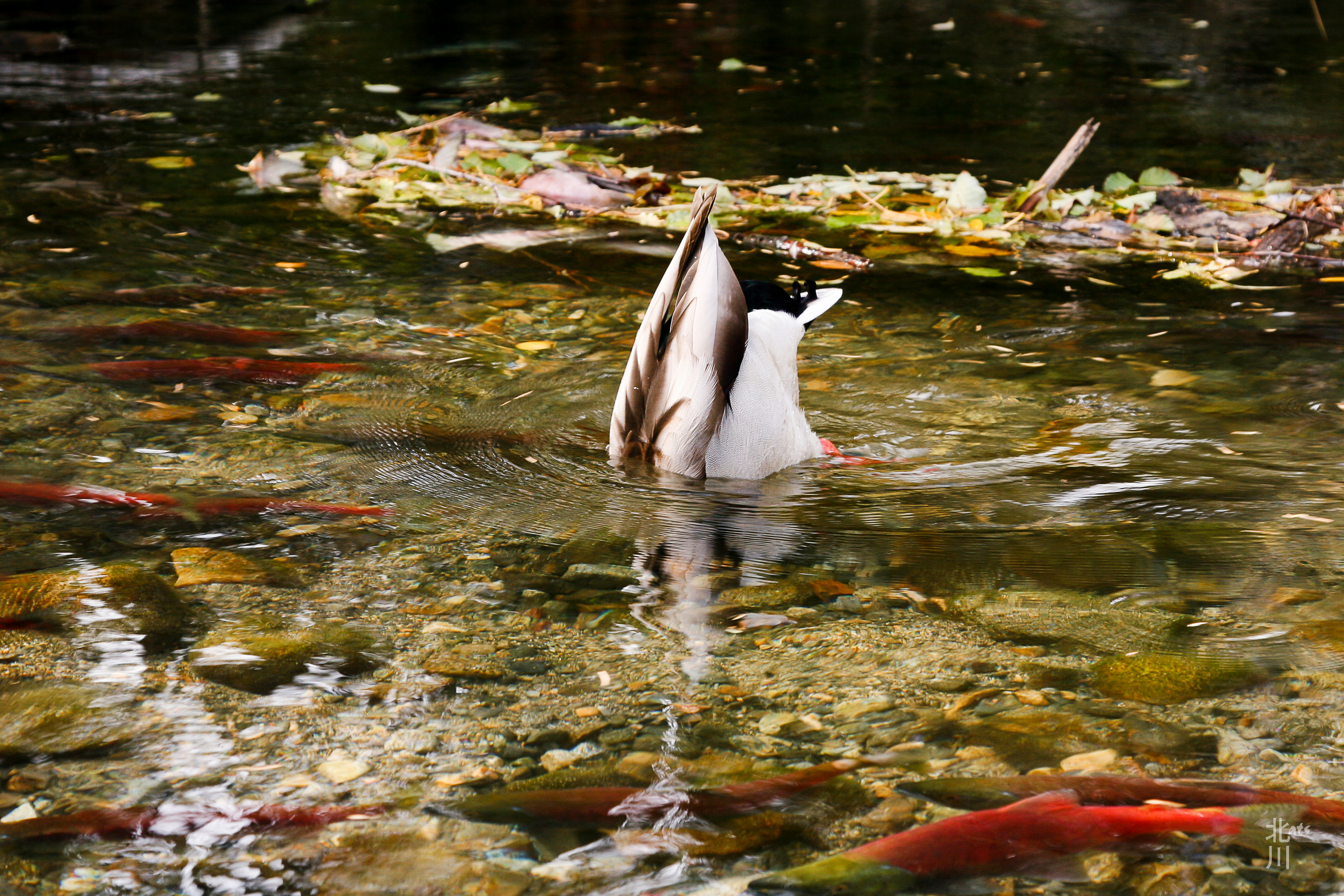 This Mallard was diving for food as the Kokanee salmon swam by.