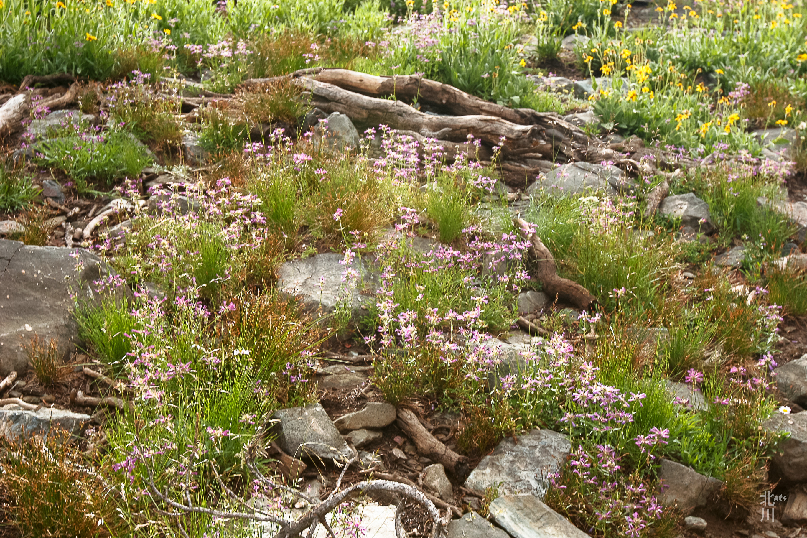 We started our descent down the mountain. The weather heading down was intermittent rain and then the sun. The moments of light brighten up these these high mountain wildflowers. Most of the blooms were spent but they still had enough color to pop into view along the trail.