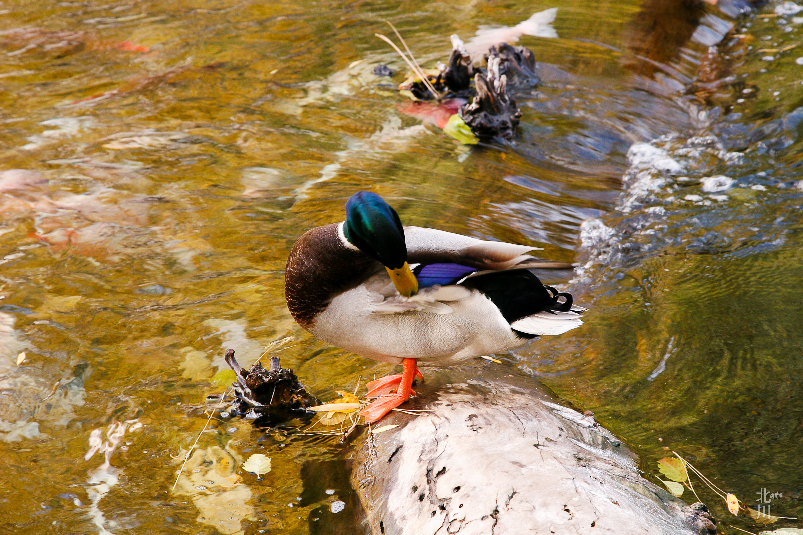 Here’s our friend the mallard standing on a log, grooming himself while the Kokanee run up river.