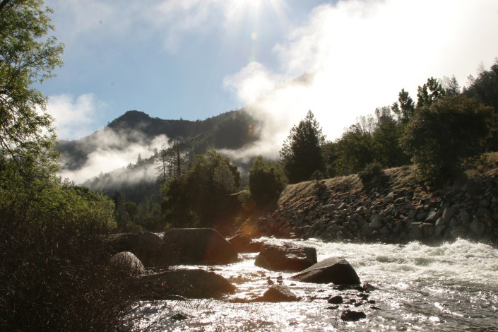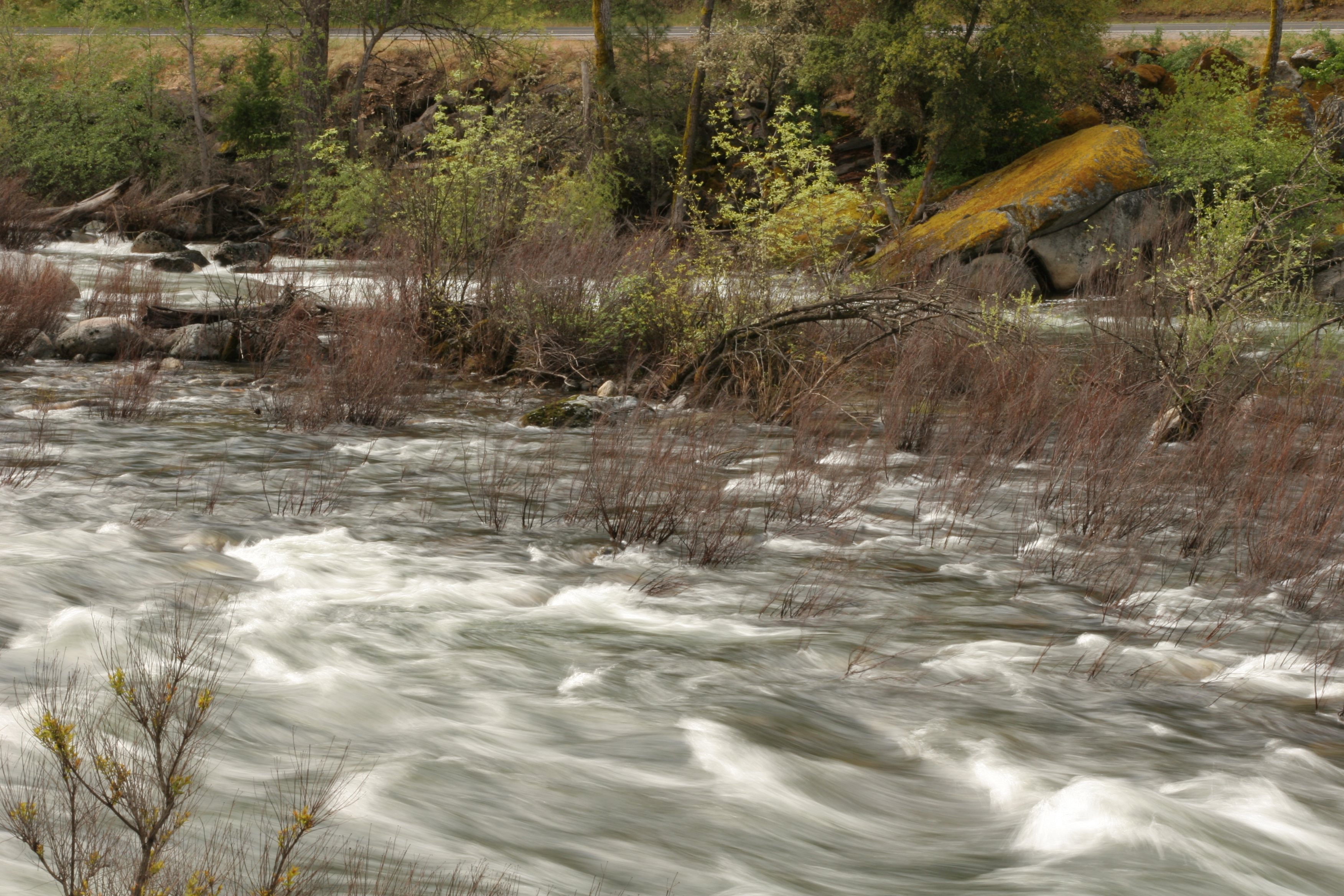 Taken off of highway 120 in California – The daylight reflecting in the top pool as the waterfall feeds it. Lightly snow capped stones in the water and a swirl of foam made this an interesting photo.