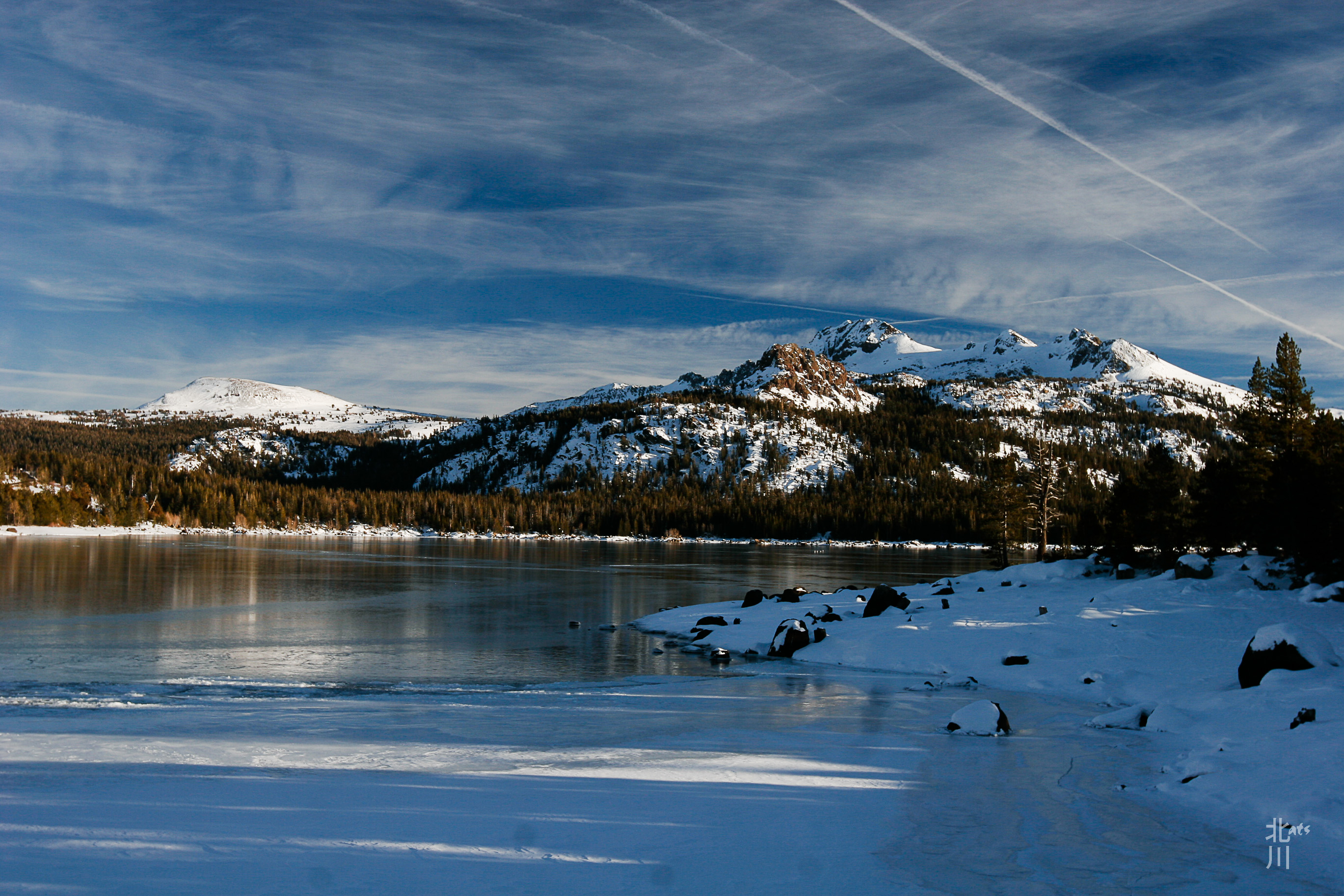 Caples Lake after the recent snow storm, the natural blue tones are highlighted in the sky, water, snow and ice forming.