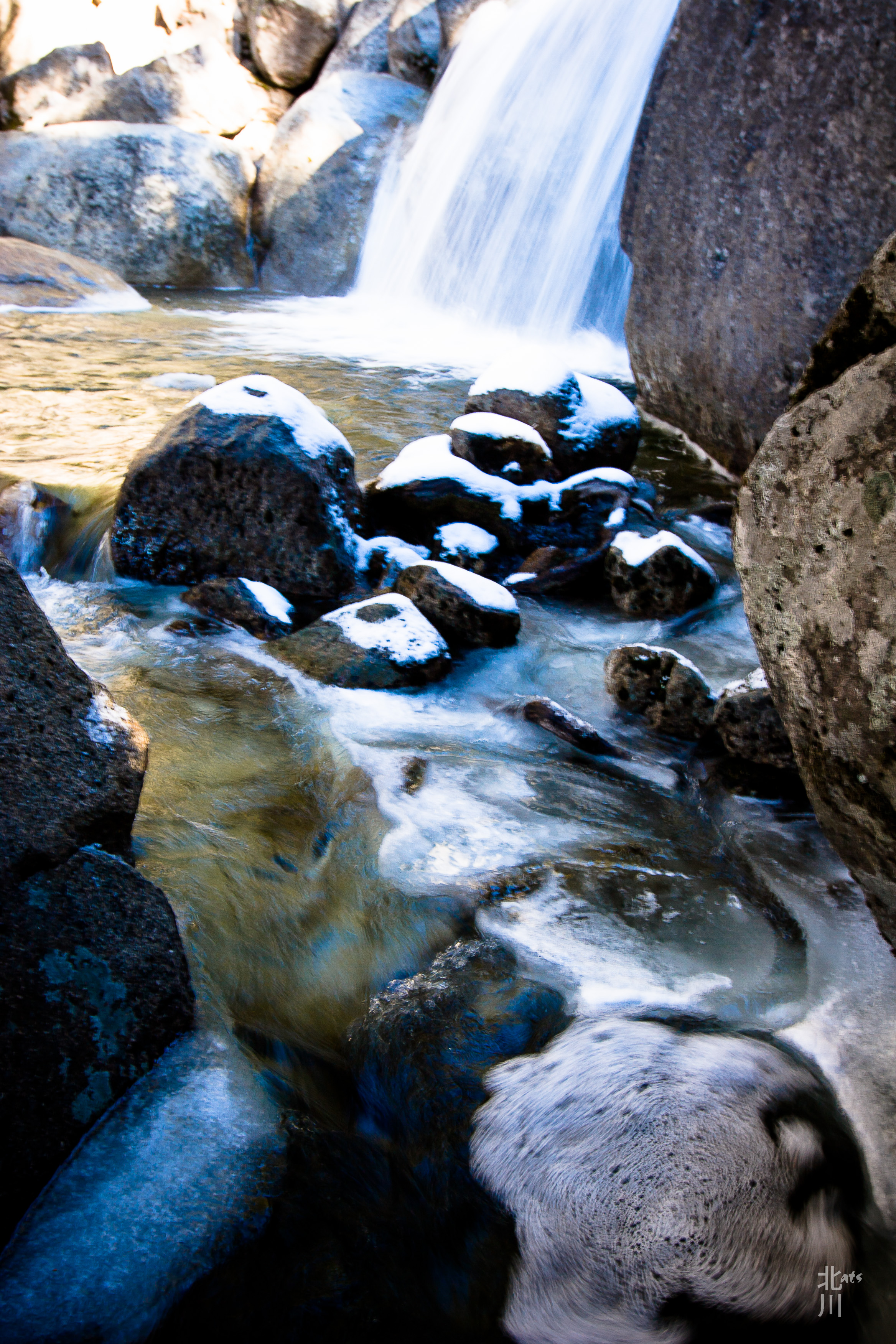 Taken off of highway 120 in California – The daylight reflecting in the top pool as the waterfall feeds it. Lightly snow capped stones in the water and a swirl of foam made this an interesting photo.